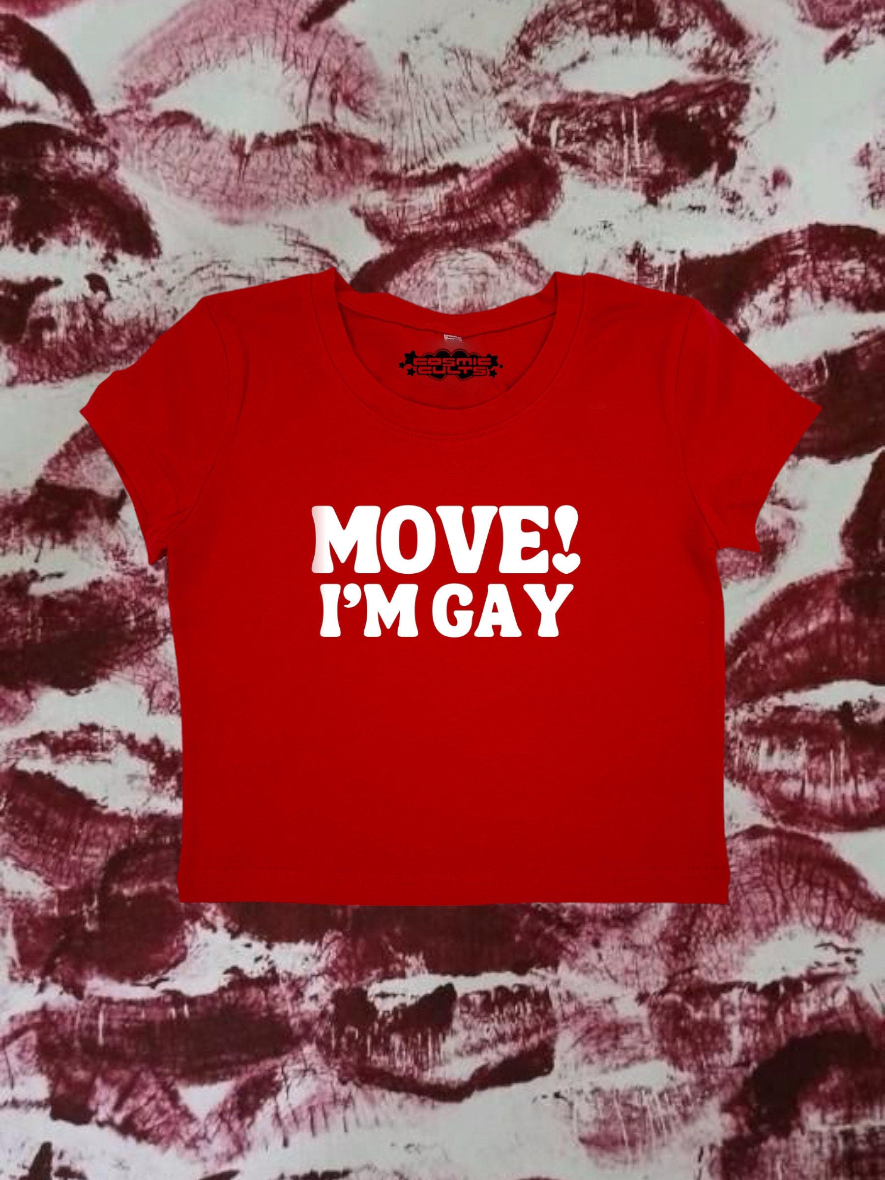 Crop top with “Move I’m Gay” - design printed on a 95% cotton 5% spandex, form fitting, available in multiple colors 💞