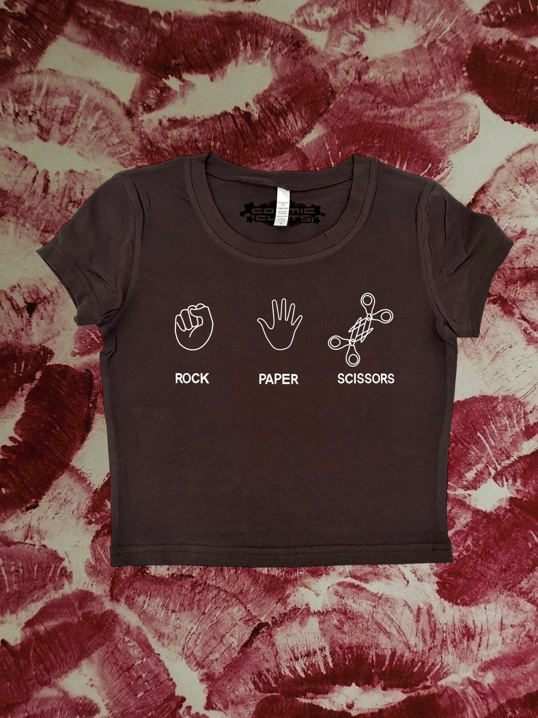 Crop top with “Rock Paper Scissors” - design printed on a 95% cotton 5% spandex, form fitting, available in multiple colors 💞